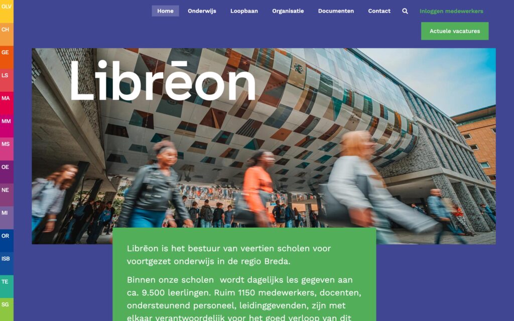 Schoolbestuur Librēon is recent van naam gewijzigd. Bij een nieuwe naam hoort ook een nieuwe visuele identiteit. En bij een nieuwe visuele identiteit hoort natuurlijk een website die daar perfect op aansluit. In samenwerking met de ontwerper van alle huisstijlelementen is de nieuwe website van Librēon gerealiseerd. Het ontwerp is door Webgrades vertaald naar een responsive website die op alle apparaten goed werkt. Daarnaast is er een aantal custom elementen aan de website toegevoegd. Zo heeft Webgrades een koppeling gebouwd met de externe vacaturesite, zodat vacatures van alle scholen automatisch en in de huisstijl op de website verschijnen. Daarnaast is er de unieke interactieve scholenwaaier aan de linkerkant van elke pagina, waarmee alle scholen binnen het schoolbestuur een mooie prominente plaats op de website van Librēon hebben gekregen.